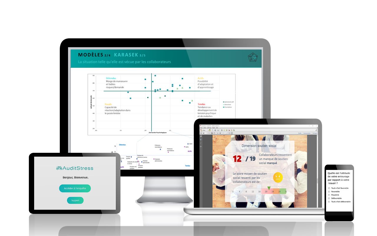 Construit méthodiquement avec une expertise pluridisciplinaire (RH, management, psychologie, ergonomie...), le questionnaire passe en revue tous les aspects du Stress et des Risques Psychosociaux, pas seulement les troubles musculosquelettiques ou l'aspect job strain.