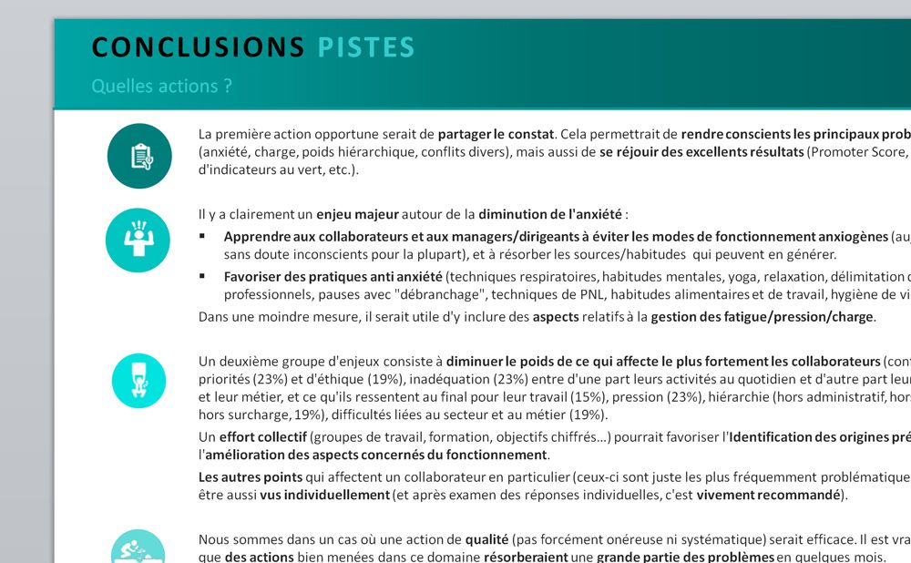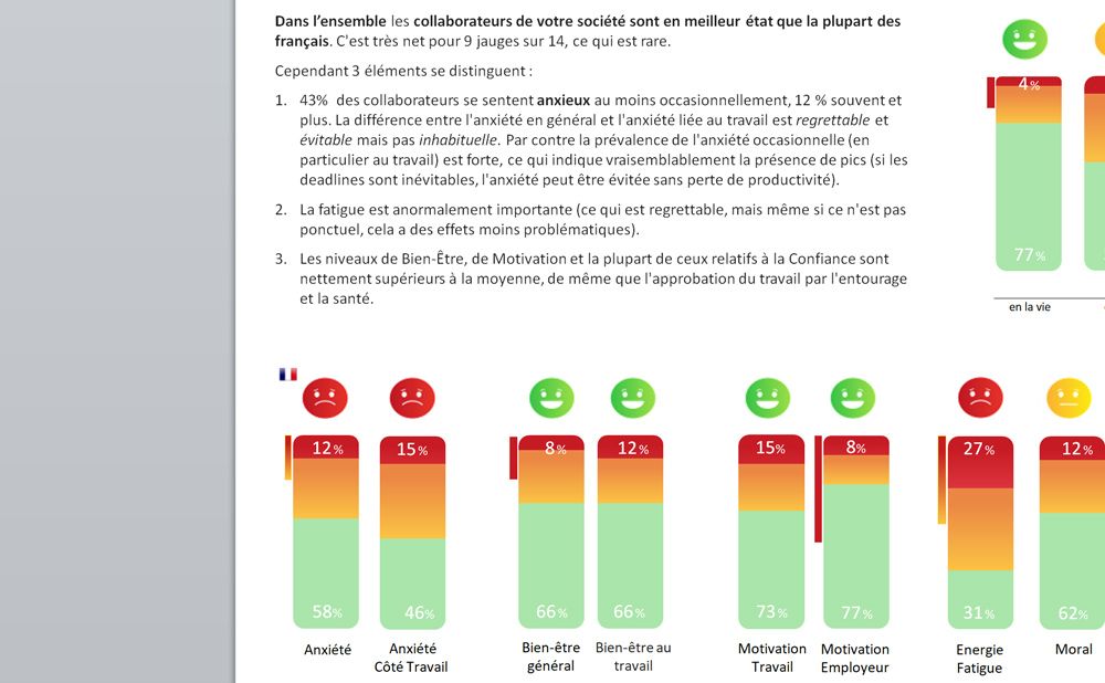 Votre enquête AuditStress contient tous les éléments dont vous pourrez avoir besoin pour comprendre et agir : le Stress, les Risques Psychosociaux, l'Etat des Collaborateurs, les Mécanismes et leurs Causes...